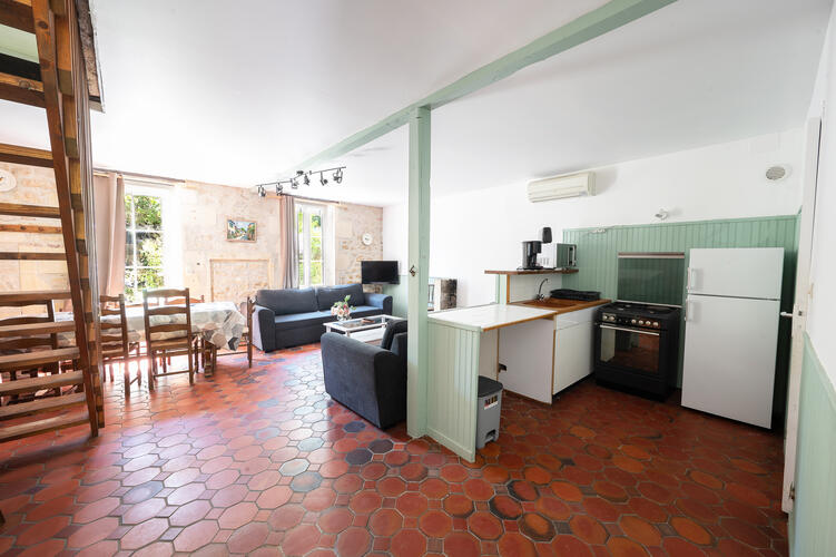 It has a kitchen and living room with sitting area, a terrace with garden furniture, a bathroom with toilet, and upsatairs a dormitory room.